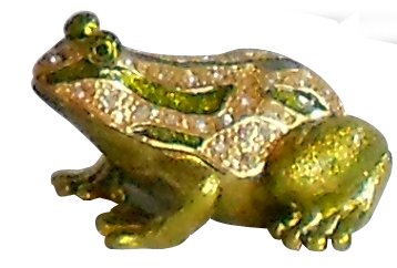 Here’s an impressive figural frog jewel box! This big handsome hinged metal frog box is enameled in gold. He has textured stripes running down his back, which are inlaid with sparkly clear color Austrian crystals. His eyes are large green crystals. A nature lover’s dream ! The top opens on a hinge, and is held closed with a magnetic clasp. Opens wide for LOTS of trinkets.