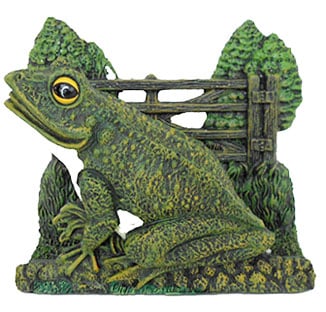 This beautifully detailed green frog napkin holder is a unique item. It features a very handsome friendly frog sitting on a rock ledge In front of a country gate, backed by two lovely bushes. It is a size large enough to hold several napkins. It is all done in an interesting rough, nubby texture—–Very attractive as well as functional—