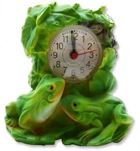 A lovely shade of green with touches of pink, describe the colors of this lovely quartz clock. Two realistic little frogs adorn the face of the clock—one, on top, looking down—and the other perched on the base of the clock, seated beside a pink-leafed flower. A pretty setting for a pretty as well as functional piece. Battery (not included).