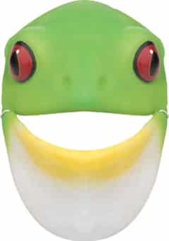 A green froggy mask with large bulging red eyes, made of light weight, but durable tough foam, is perfect for your costume party. It has an adjustable elastic cord attached to the back, to hold it securely to your face. The mouth is extra large to enable you to breathe freely and to enhance your vision. Ages 3 and up