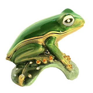 They call her “Legs Lilly”. She is an attractive green glazed glass Lady Frog sitting with her legs exposed & red-crystal toes, on a jewel encrusted lily pad. These frog legs are not for eating. They are for Lil’s admirers. Open Lil’s mouth and place your small treasures within her glazed interior. E-N-J-O-Y