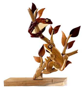 Two lovely frogs, both perched on a green leafy realistic branch, comprise the handcrafted design of this unique table d̩cor piece. The beauty is in the simplicity and artful craftsmanship of this table decoration. It is indeed, pleasant to the eye, and the handcrafted frogs themselves, are smooth to the touch. Display with Pride!