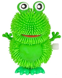 Talk about adorable and fun to feel and play with. This little green, very soft to the touch, Happy Hopper Wind-Up Froggy, made of a rubberized chenille type of material, with two big bulging eyes, is sure to please kids of all ages. Makes the greatest party favor: Just wind him up and watch his all body shiver and shake as he hops around. These special frogs do more than leap. They shimmer, shake, dart, and dance when you wind them up, all the time movin to the grovin. The soft rubbery spike just add to the fun.
