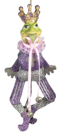 Purple Jumping Jack Glitter Frog Prince Ornament makes a wonderful gift for adults and children alike. Kids love the jumping jack ornaments because they can make them dance! With one gentle pull of the cord, the arms and legs go up, delighting a child with the simple animation!