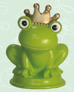 He is absolutely adorable. With his gold crown, bulging eyes and wide mouth grin, he can’t help but attract big smiles from everyone. Talk about packaging—In a transparent plastic case, with party items pictured on the bottom and tied on top with a pretty white bow, you can’t beat the excitement of presenting him as a gift. Ideally packaged for baby showers or, keep him yourself to delight your guests.