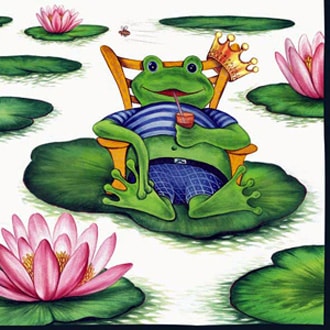 King Frog Luncheon Napkins! The King and Queen are on Holiday. The King has hung his crown on the edge of a floating Lilly pad, as he sips a soda and floats away. The Queen is equally at ease as she also reclines on a floating Lilly pad, catching flies. The napkins come 20 to package, are double-sided, and made of high-quality luxury paper. Fun & Functional- Set 0f 20
