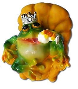 What could this royal king frog be sipping out of his silver goblet? Whatever it is , he seems to be thoroughly enjoying it. Seated on his big yellow throne, wearing his silver crown, he’s happily guzzling away. Made of polyresin