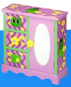 Enamel gloss finished 3 drawer jewelry chest. Has decorative handles and one mini cabinet with photo frame front.
