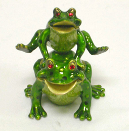 Two handsome ,happy, green glazed ceramic frogs in the ever-popular leap frog position, are thrilled to top a lovely Trinket Box. The frogs, predominantly green have lighter green chests and the most fetching red ,glowing crystal eyes. One frog sits atop the other with feet out-stretched, enjoying the ride on the larger lower frog. A hinged door opens to reveal space to store your small treasures.