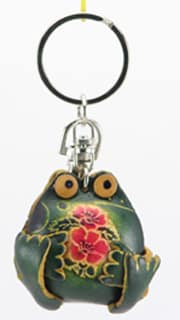 Handsome and Unique Leather Key Chain that is hand crafted by the same artisans that create the popular Coin Purses. is now available. Here we have a two-sided designed little froggy. One side depicts a pudgy little guy, hand tooled with flower design. An attractive circle designed pattern is etched on the frog’s back. A large split ring for attaching keys is attached to frog’s head by lobster claw closing.