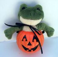 Cute little frog is sitting inside this plastic pumpkin. Great for decorations and great for a gift for someone special.