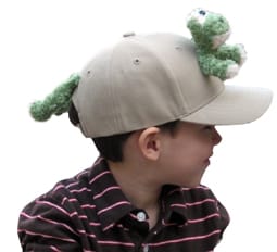Put a smile on everyone’s face by wearing this fun-filled funky baseball cap. It is an authentic cap with wide brim and stitched vent holes and button on top. However—-this cap has a little friendly froggy face with outstretched hands attached to the front, right in the middle. His two legs appear next to the Velcro sizing band, sticking out across the back. Funky, Indeed, and appealing to kids of all ages.