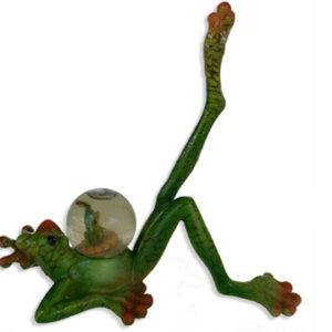 Here we have a glazed green frog, water globe. The frog’s leg is completely outstretched as he lies on his back. In his lap, is a lovely water globe, filled with crystal glistening water pellets. Inside the middle of the globe, sits a baby frog, also in a stretching position. Turn the globe over gently, and cascading down are gleaming, shiny crystal water drops–“Enchanting” is the word!