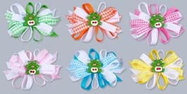 These cute as can be Gingham Froggy Hair Bows are slightly smaller in size than the large. They are, however, crafted exactly the same: Made from Gingham and solid color ribbon tied together with an adorable little frog in the middle of the bow. Snap these up for party favors, give-away’s etc. They are truly Unique. Comes with sturdy silver clasp in back. Assorted colors.