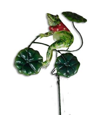 A glossy metal little green frog, riding a bicycle, wearing a bright polka-dot scarf, is the main focus of this green garden stake. He is mounted on the stake, atop of a winding ivy covered vine, which actually turns out to be his unique bike. He’s original, interesting, and very easily can be inserted right into the garden soil. Metal frog sits on a spring.