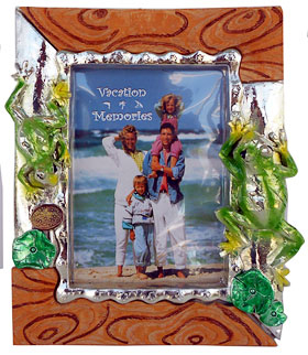 A unique combination of scrolling and iridescent metallic designing, leads to this incredibly attractive Picture Frame. The two green metal iridescent 3-D Frogs, which line each side of the frame, mingling with 3-D blossoms, hug the center metal framing. It is truly a well designed, beautiful Frame.