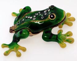 Both whimsical and charming is this little jeweled frog box. He is enameled in a shimmering green finish, with colorful yellow feet, and has handsome black enamel eyes. To give it that touch of sparkle, his body is inset with clear crystals. He opens easily because of his hinged body and is ready to store small items elegantly.