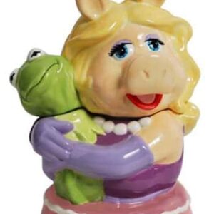 The ever delightful, colorful, glamorous, and gorgeous Miss Piggy, now has her own cookie jar. With her blonde, wavy, long-flowing hair, she smiles with glee, as she clutches her ever-lovin’ Kermit to her heart. “Bring on the Cookies, Boys,” she seems to be saying. “Just Fill Us Up and Make Us Happy.” Who can refuse Miss Piggy? Bring her home–place her on your counter—-and make everybody’s wish come true!!
