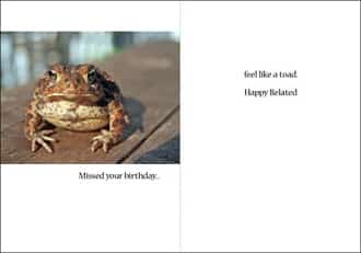 This birthday card is just perfect for the peson that always seems to send birthday cards late …White envelope included. Outside of card reads: “Missed your bithday ” Inside card reads: feel like a toad. Happy Belated