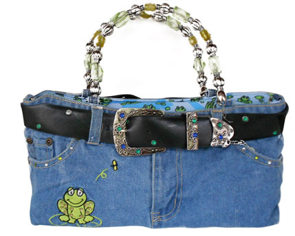 WHERE Did You Get THAT Bag? That phrase will be burning your ears from admirers of all ages.Let me tell you about THAT bag: Picture a pair of cut-off denim shorts with two side studded pockets in front and two back pockets.The most awesome black leather-like belt also crystal studded is looped front and back with a western-style metal,jewel encrusted buckle that is artistically crafted.On the front lower left side sits an adorable embroided colorful frog on a lily pad .That’s not all: Beautiful yellow crystal and brilliant large metal faceted beads form the double handles. The inside is fully lined with a whimsical froggie print and side zippered compartment. As an added bonus an extra beautiful shoulder bag attachment is enclosed. NOW IS THIS NOT THE MOST FUNKIEST AND CHIC FROG HANDBAG EVER?
