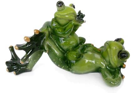 Both are made of glazed poly-resin in a shaded brilliant green color. The toes of both frogs are accented in gold.