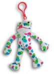 This is our best seller, Mini Clip-On Frog. He is white in background color with various multi-color circles. He is made of soft plush–extra soft furry soles, black beaded eyes, big red hook and Velcro hands. You can experiment with his hands and twist them into as many positions as you can think of. You will also exercise your brain as to where you choose to hang and display him. It’s a No-Brainer, however, if you choose to own the whole collection.