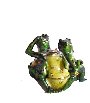 Three frogs, can’t-see, can’t hear, can’t talk, all joined together and decorated in dark green enamel cast metal. They are studded in sparkling amber Austrian crystal. The box opens on a hinge, and is held closed with a magnetic clasp. The inside reveals three small separate compartments. This is an adorable whimsical conversation piece.