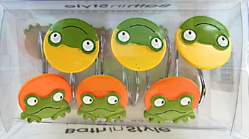 Packed nicely is a set of 12 (twelve) shower hooks. Six hooks are orange – footed and, six hooks are yellow smiling frog faces. Great to hold your shower curtain in place with these stylish, sturdy frog shower hooks.