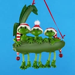 Hop into the Christmas froggy fun with these adorable amphibians complete with Santa hats. Personalized with a black paint pen. It’s designed so you can write something on the lilypad, if you like (the year, or your names, or a special message). this ornament comes ready to hang with a red ribbon. 3 x 5 ornament crafted in resin.