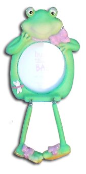 Frame your special loved one is this adorable shelf-sitting froggy frame. The resin frog is wearing a pink poka-dot bow and flip flops. On the lower corner sits a cute dragonfly. His two 3″ legs dangel freely. Holds a 2.5″ x 2.5″ picture.