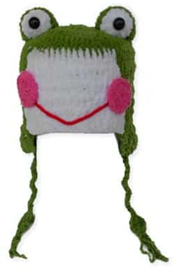 Made of all Wool, this Perky & Fun Hat is Adorable. It’s green & white in color with two big pink cheeks and red mouth. It ties at the bottom for a secure closing. It’ delightfully soft and snuggly and made for whimsical glances and toasty warmness.