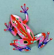 Gorgeous rain forest frog metal art wall plaque. This is beautiful art is hand pounded and hand painted to make a realistic look of a rain forest frog. Cool pink shades make this frog come to life