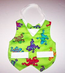 HOW CUTE? Your own little froggy friend can have is very own froggy bib to keep his clothes nice and clean. 100% cotton and made in the U.S.A. Just adorable, has a tie in the back of the neck. Infant size.