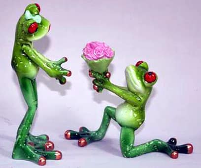 Two Romantic Frog Figurines Made of Polystone – He’s on Bended Knee Asking for Her Hand in Marriage and Offering a Bouquet of Flowers and She’s Obviously Saying Yes .