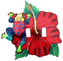 Hand painted metal frog double switch plate. This gorgeous colorful tree frog is laying on a red hibiscus. They are imported from Hades and colors may vary . Each piece is an original.