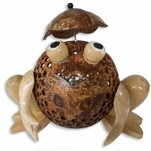 Under the expert hands of clever eco-friendly artisans, comes this unique handcrafted whimsical frog electric lamp. The recycled coconut shell is precisely crafted into a rolly-poly shaped frog, with coconut umbrella, big bulging hand painted eyes, recycled bleached wood movable arms and wooden large legs. The body is stylishly cut with numerous openings which provide ambient lighting, therefore saving light- bulb energy. When lit, this unique handcrafted frog lamp, sheds a special glow. You’ll Love it, as will everyone else!
