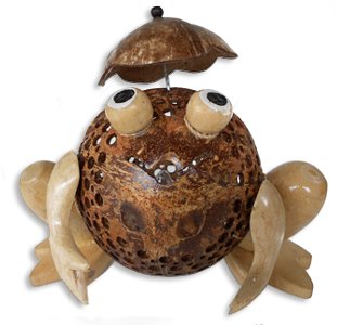 Under the expert hands of clever eco-friendly artisans, comes this unique handcrafted whimsical frog electric lamp. The recycled coconut shell is precisely crafted into a rolly-poly shaped frog, with coconut umbrella, big bulging hand painted eyes, recycled bleached wood movable arms and wooden large legs. The body is stylishly cut with numerous openings which provide ambient lighting, therefore saving light- bulb energy. When lit, this unique handcrafted frog lamp, sheds a special glow. You’ll Love it, as will everyone else!