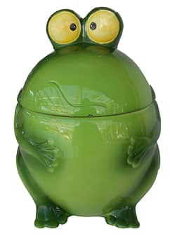 Such a cute Rolly Polly frog cookie jar, all done up in colors of vivid green, dotted with darker splashes of green. His two little hands are holding his pudgy belly, hoping for a big batch of yummy cookies to fill him up. Add charm and delight to your kitchen with this little guy on your counter.