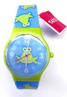 A large round-faced Froggy Watch made of durable plastic, makes a great gift for a favorite kid.Its prominent colors are yellowish green and blue. Soft to wear, and metal allergy free, are added features, as well as its large, easy to read numerals. Its Funky and Functional as well!.