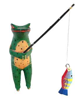 He is all handcrafted—hand carved in wood—-hand painted–and completely adorable. Sit him on any shelf and watch him dangle the (also handcrafted) fish, he just caught, with the little fishing rod, he holds proudly in his hand. Simply a delightful froggie fisherman, indeed.