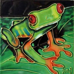 This lovely Tree frog on a Leaf Art Tile was hand crafted of beautiful glazed Ceramic, with a keen eye toward brilliance of color, durability and attention to detail. It is so durable that our customers use them as hotplates. They make awesome decorative displays of art on your wall, shelf or inlayed as accent tiles on an end table etc. (fold-out brace on back for standing)