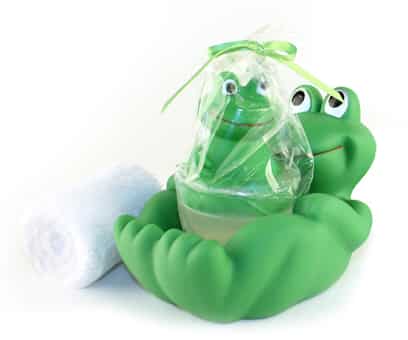 Here is an entire set to accompany the cute frog soap. We have an adorable large-sized frog floating on his back and holding a white terry washcloth, plus an additional bar of froggy soap. Wrapped up in a lovely yellow tied plastic package…great for gift giving.