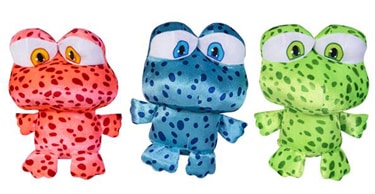 So buttery soft is this adorable plush frog—-all dressed up in a spotted design from head to toe. His cuteness can be spotted where ever he goes. Uniquely designed to be cuddled and held. and also to be perched up against your bed pillows, when he gets tired. He has enormous magical eyes that match his spotted body. Comes in assorted luscious colors—–sky blue–lime green, and lipstick red.