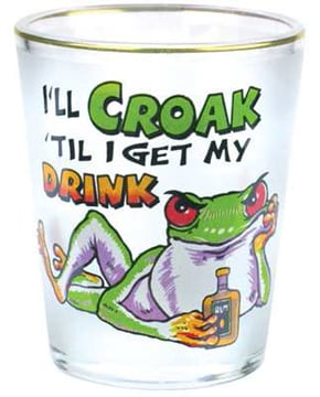 A gold-rimmed frosted Frog Shot Glass with a picture of a frog on the front, exclaiming impatiently: “I’ll CROAK ’til I get my DRINK”, comprises this fun Frog Shot Glass.