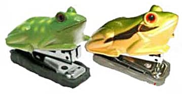 Frog mini staplers are made from hard plastic with a specially designed groove behind the eyes where your thumb is placed when using the stapler. It uses small size (not full-sized) staples. A great desk accessory!