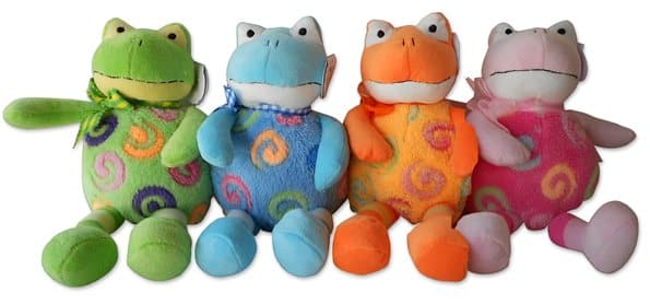 We bring you the Plushiest of the Plushiest….The most Colorful of the Colorful….The Softest of the Softest…In Other Words: Top Shelf–Beautifully Crafted Plush Stuffed Frogs! The colors just jump out at you. The quality of the plush is top-grade. They are cuddly and squishable beyond belief. Four gorgeous colors: green, blue, orange and pink make up the assortment. Each adorable frog has movable, floppy arms and legs, which are color coordinated to the multi-color swirly print on his pudgy belly. Each comes with a matching ribbon around his neck. You will absolutely love these little guys–Guaranteed! Collect all four colors. Please select color preference, below.