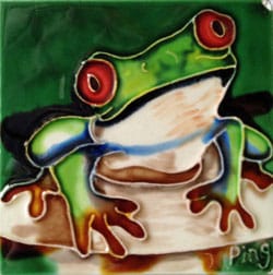 Here we have a smaller version of a beautiful art tile, that of a colorful tree frog perched on a rock., Made of fine quality glazed ceramic, the frog is green, blue, rust and white with large red eyes., He is truly a work of art. He can be hung on a wall or using his fold – out brace on the back, he can stand alone on a shelf, desk, etc.