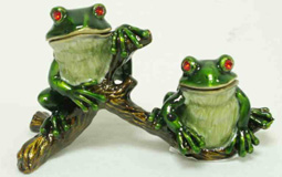 Two happy frogs with glistening red crystal eyes, seem to be having a great time perched atop their tree limb.They both have wide happy grins which makes them a delightful figurine to display. Their beautiful dark green enameled bodies and light green throats are very attractive. They of course are functional as well if you just open their hinged heads, you will find two storage compartments for your small treasures.