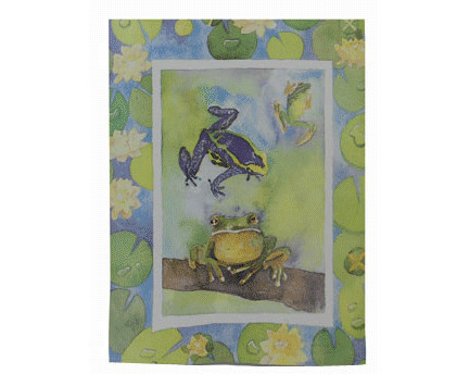 All inclusive, Frog Writing Portfolio. includes lovely, colorful cardboard portfolio with separate compartments for twelve (12) sheets of ruled writing paper & six (6) mailing envelopes. The double-sided portfolio is designed with front and back pictures of authentic frog species, which are reproductions of Artist, “Lucy Davies” original paintings of frogs. The envelopes and writing paper also have the same impressions of the frogs printed on the portfolio. Makes nice gift! Assorted Styles