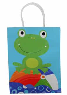 Carry your gift in this colorful, whimsical frog gift bag, and be assured of pleasing your recipient. On light blue background, sits our happy, friendly frog, eager to reveal its contents to the happy celebrating person!!